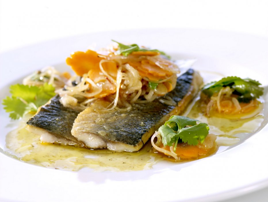 Филе норвежской сельди разделать на равные кусочки, поместить в стеклянную посуду и залить предварительно смешанным маринадом. Мариновать в течение двенадцати часов. Овощи нарезать ломтиками, сбрызнуть лимонным соком, приправить специями и поджарить на гриле. Поджаренные овощи выложить на замаринованные кусочки филе, украсить свежей зеленью и полить ароматным соусом.