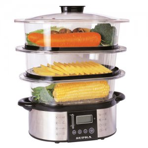 Характеристики модели: Мощность: 800 Вт, Максимальный объем продуктов: 11 л, Необходимое кол-во воды: 1 л, 3 основные чаши + чаша для приготовления риса, Программируемый таймер с ЖК дисплеем, Сенсорное управление, 6 режимов приготовления, Автоотключение, Звуковой сигнал при отключении, Компактное хранение, Корпус из нержавеющей стали, Удобный долив воды, Цвет: серебристый.