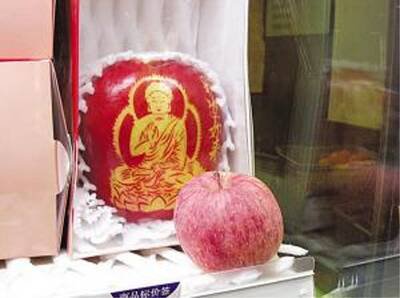 Для достижения аномально больших размеров на дереве оставляется только 2 яблока, за которыми ведется самый лучший уход. Особенностью этих яблок, кроме большого размера и длительного срока хранения, является изображение Будды, нанесённое специальной краской. Неудивительно, что цена таких яблок превышает 1000 долларов. Буддийские яблоки в Китае имеют статусное значение – их покупают владельцы фирм и магазинов, дарят высокопоставленным лицам.