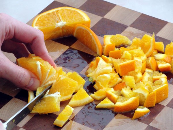 Осмелев, я стала резать цитрус на кубики. Потом сгребла кусочки фрукта в мисочку, ополоснула доску и внимательно осмотрела ее поверхность. Ничего. Апельсиновый сок не оставил ни следа. Здорово, подумала я, вспоминая свою оранжево-зелено-розовую доску из пластмассы. Думаю, дело – в масле, которым обработаны разделочные доски из дерева.