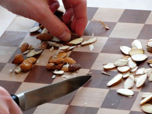 Очень уважаю миндальные орешки – люблю украшать ими овсяное печенье, творожные запеканки и шарлотку. Но делаю это редко, потому что нарезать миндаль тонкими лепестками – задача не из легких, нужно много времени и ювелирное мастерство. В одной руке нож, другая удерживает одновременно и доску, и орешек. Вспоминая, как твердо и уверенно доска стояла на столе, когда я резала овощи, я подумала, что ее «непоколебимая позиция» поможет мне справиться и с орехами. И действительно, когда доска не скользит по столу, можно полностью сосредоточиться на процессе. Результат – на тарелке.