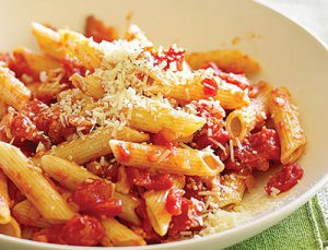 Ригатони варить в подсоленной воде согласно инструкции на упаковке, пропустить через дуршлаг и тщательно перемешать с томатным соусом. Сервировать на предварительно подогретые тарелки, украсить листьями сельдерея и тертым пармезаном.