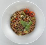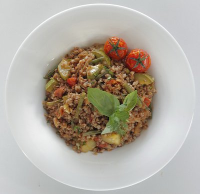 Гречневую крупу залить 2,5 стаканами горячей воды и варить под крышкой в течение 20 минут на небольшом огне. Нарезать лук полукольцами, помидоры и кабачок нарезать крупными кубиками. В глубокой сковороде разогреть растительное масло, положить овощи и обжарить на сильном огне в течение 3-5 минут, часто перемешивая. Уменьшить огонь, влить соевый соус Kikkoman и тушить под крышкой до готовности. Соединить с рассыпчатой гречневой кашей, аккуратно перемешать и посыпать мелко нарезанной петрушкой.