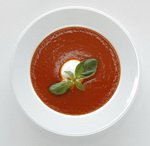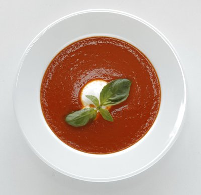 Разогреть в кастрюле оливковое масло и потушить мелко нарезанный лук и чеснок до прозрачности. Добавить томатное пюре и нарезанный небольшими кусочками красный сладкий перец. Влить соевый соус Kikkoman, добавить сахар и готовить на небольшом огне 20 минут, часто перемешивая. Измельчить блендером, влить куриный бульон и водку и довести до кипения. Разлить суп по тарелкам, в каждую добавить по 1 ст. ложки сметаны и посыпать мелко нарезанным базиликом.