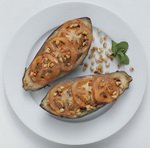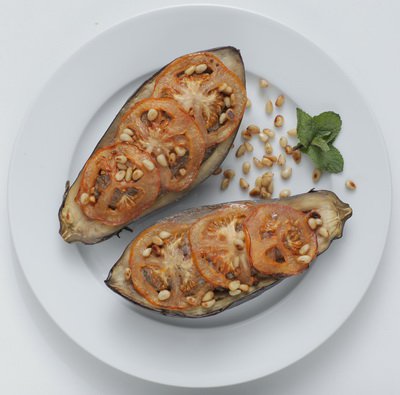 Мелко нарезать кинзу, соединить с фаршем из телятины, добавить чёрный перец и соевый соус Kikkoman. Перемешать и оставить на 20 минут. Баклажаны разрезать вдоль пополам и отварить в течение 3 минут, отвар слить. Вынуть из половинок баклажанов немного мякоти, наполнить фаршем и уложить в жаропрочную форму. Нарезать помидоры тонкими ломтиками и положить на баклажаны. Полить оливковым маслом и запекать в духовке 30 минут. Готовое блюдо посыпать кедровыми орешками и листочками мяты. Подавать с рассыпчатым рисом.