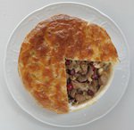 Куриное филе нарезать небольшими кусочками и обжарить на оливковом масле. Добавить нарезанные ломтиками шампиньоны и нарезанный кольцами лук-порей. Влить вино и соевый соус Kikkoman и готовить 15 минут. Положить курицу в жаропрочную форму, добавить веточку тимьяна, клюкву и орехи и накрыть крышкой из слоёного теста. Смазать тесто взбитым яйцом, прорезать несколько отверстий для выхода пара и выпекать в духовке в течение 30 минут.