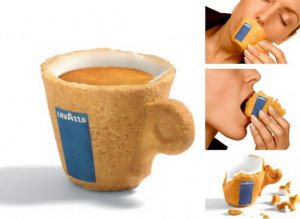 Мечта любой женщины - меньше грязной посуды. Не ошибусь, если это мечта и любого места общепита. Итальянская компания Lavazza, поставляющая для ресторанов качественный кофе придумала подавать его в съедобной бисквитной чашке. Удобно!