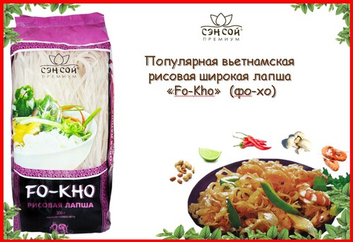 Одними из самых вкусных разновидностей рисовой лапши являются фо-хо и ху-теу, которые подходят для заправки супов («Фо-Бо», «Фо-Га») и бульонов, могут подаваться в качестве гарнира или как самостоятельное блюдо. При этом эту лапшу можно не только отваривать, но также обжаривать в соусах и специях, тушить. Если вам захотелось окунуться мир экзотической кухни Тайланда, то достаточно взять лапшу фо-хо и обжарить ее в специальном готовом соусе « PAD THAI» (от «Сэн Сой Премиум»), и вот у вас на столе изысканное аппетитное блюдо — побаловать себя и удивить гостей очень просто.