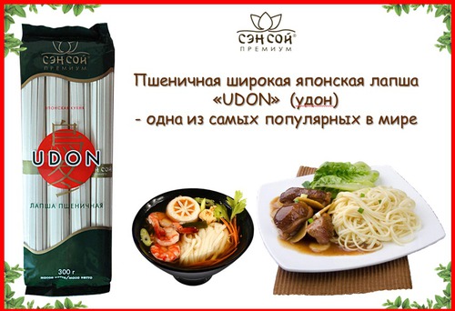 При приготовлении японской лапши удон не используется яйцо. Удон — калорийное и сытное блюдо, которое, как правило, подается горячим, как суп с лапшой в бульоне и декорируется нарезанным зеленым луком. Лапша удон очень любима японцами, она особенно хороша с грибами (шиитаке, шампиньоны, вешенки), тушеными овощами, курятиной.