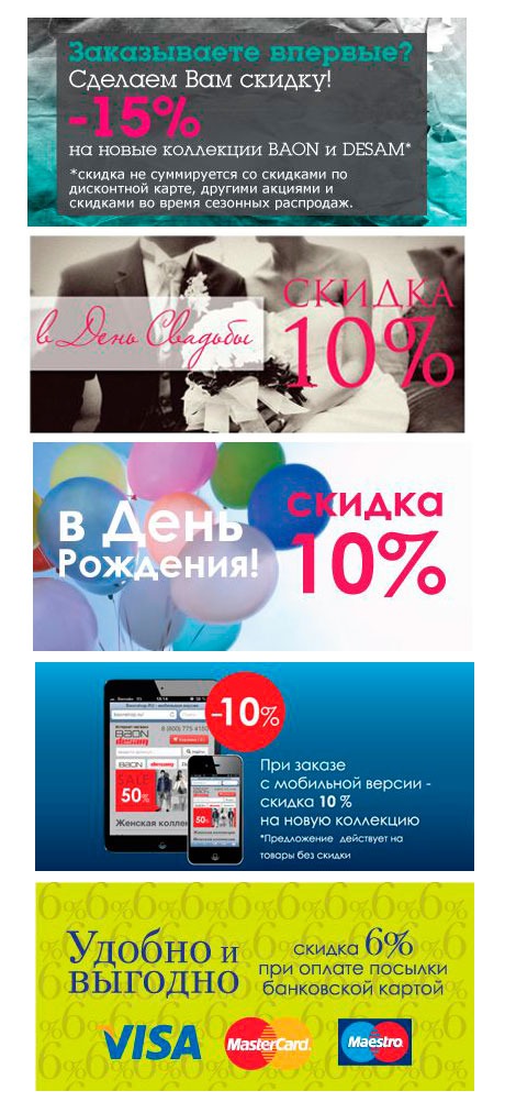 6. Получить скидку 6% на товары из новой коллекции вы можете при оплате своего заказа банковской картой (данная акция действительная для заказов, отправляемых по почте).