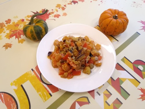 Нарезаем небольшими кубиками овощи. Пассеруем лук до золотистого цвета. Добавляем тыкву и баклажаны и грибы тушим на оливковом масле 10 минут при высокой температуре, постоянно помешивая. Добавляем сладкий перец, затем сметану. Тушим ещё 5 минут на среднем огне.