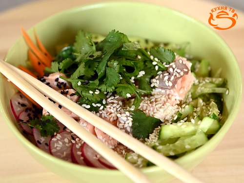 5. Когда всё готово, собираем блюдо: выкладываем в отдельную миску рис, поливаем его соусом, добавляем нарезанные овощи, зелень, салат чука, сверху – запечённую рыбу. Посыпаем блюдо чёрным и белым кунжутом.