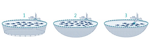 Кошельковый невод состоит из сетного полотна и канатов. Вначале крупный косяк окружается сетью, которую спускают с борта судна, после чего происходит стяжка нижней части сетного полотна, а затем рыбонасосом или каплёром (сетным сачком) улов поднимают на палубу.