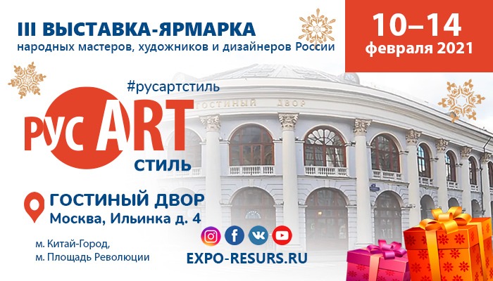 В самом центре Москвы, у стен Кремля, на престижной выставочной площадке «Гостиный Двор» (ул. Ильинка, д. 4) с 10 по 14 февраля 2021 г. пройдет III Всероссийская выставка-ярмарка народных мастеров, художников и дизайнеров «РусАртСтиль». Это культурное мероприятие станет масштабным арт – событием, популяризирующим как традиционные аутентичные изделия народных художественных промыслов и ремесел, так и современные авторские работы молодых и талантливых мастеров со всей России.