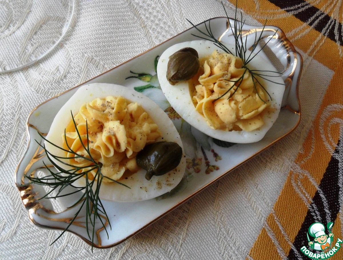 Масла я, правда, не кладу, смешиваю желток только с чесноком и майонезом, а в последнее время частенько еще рублю в начинку каперсы, ну очень мне так нравится. И последний штрих - сверху посыпать белым перцем. Ммммм!...