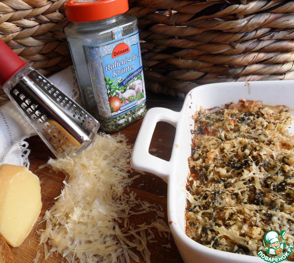 Делала в духовке, воспользовавшись комментарием к рецепту Жени Евгения 1976, и мне тоже хватило 20 минут на 180 градусах. Помидоры порезала толщиной чуть ли не в палец, а лук, напротив, тончайшими слайсами, и не прогадала. В следующий раз петрушку смешаю только с хлебными крошками и сыром закрою: запеченная свежая зелень не очень вкусна да и выглядит непрезентабельно. Кстати, пармезана у нас не бывает, использовала литовский "Джюгас", в который я просто влюблена. Еще из впечатлений - чесночка и травок не жалеть! Тут точно кашу маслом не испортишь И еще взяла себе на заметку как прекрасную горячую закуску к гостевому столу в порционной подаче, хотя мне и удалось перенести помидоры на тарелки, но все же это было делом не совсем легким.
