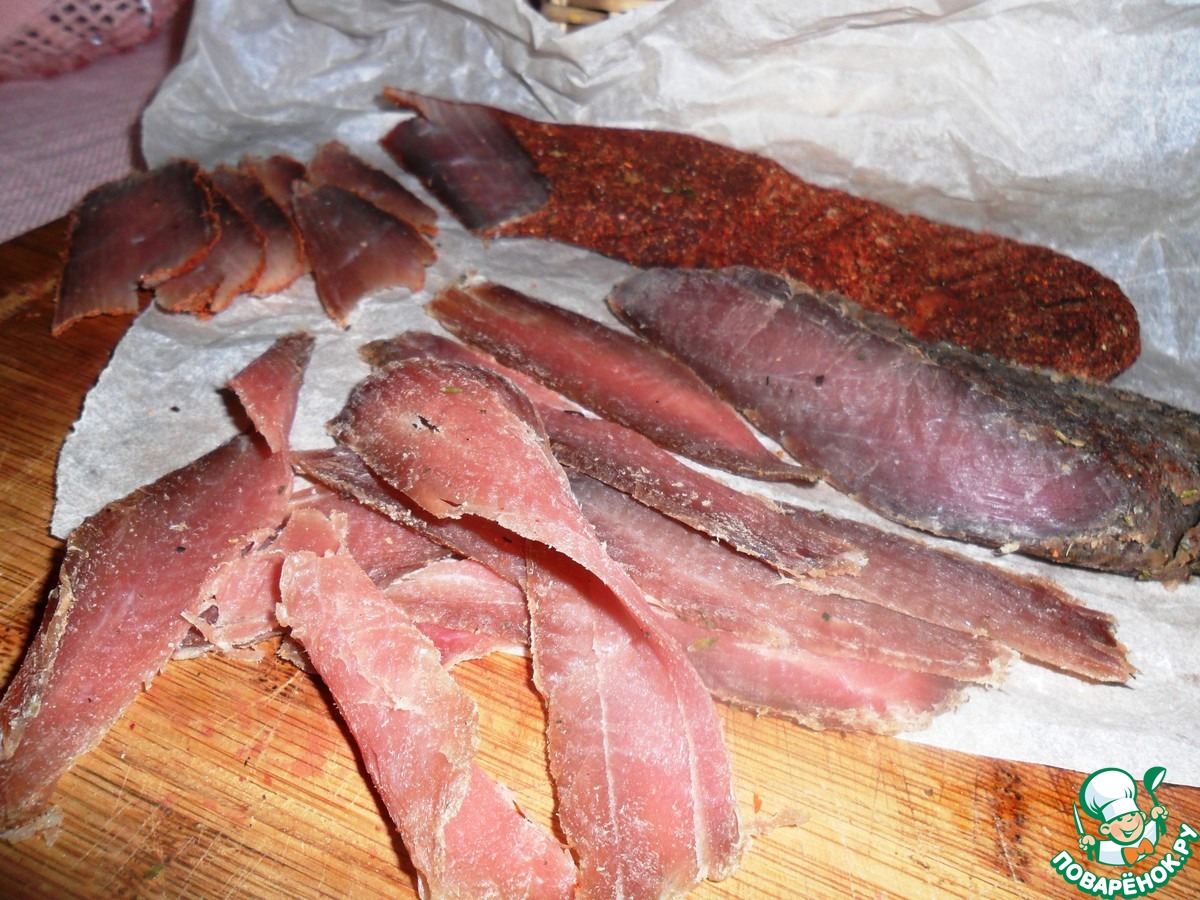 Я пришла к выводу,что для такой экспресс-сушки мяса лучше использовать маринование, чем обвалку в специях, потому что они при сушке не успевают отдать свой аромат мясу, остаются просто пряной оболочкой. А вот маринад как раз-таки оставит внутри него все вкусности после испарения влаги и это будет то, что надо!