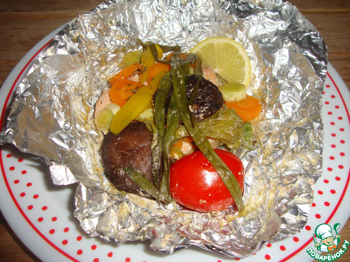 «Овощи, шиитаке и лососина в фольге на мангале»