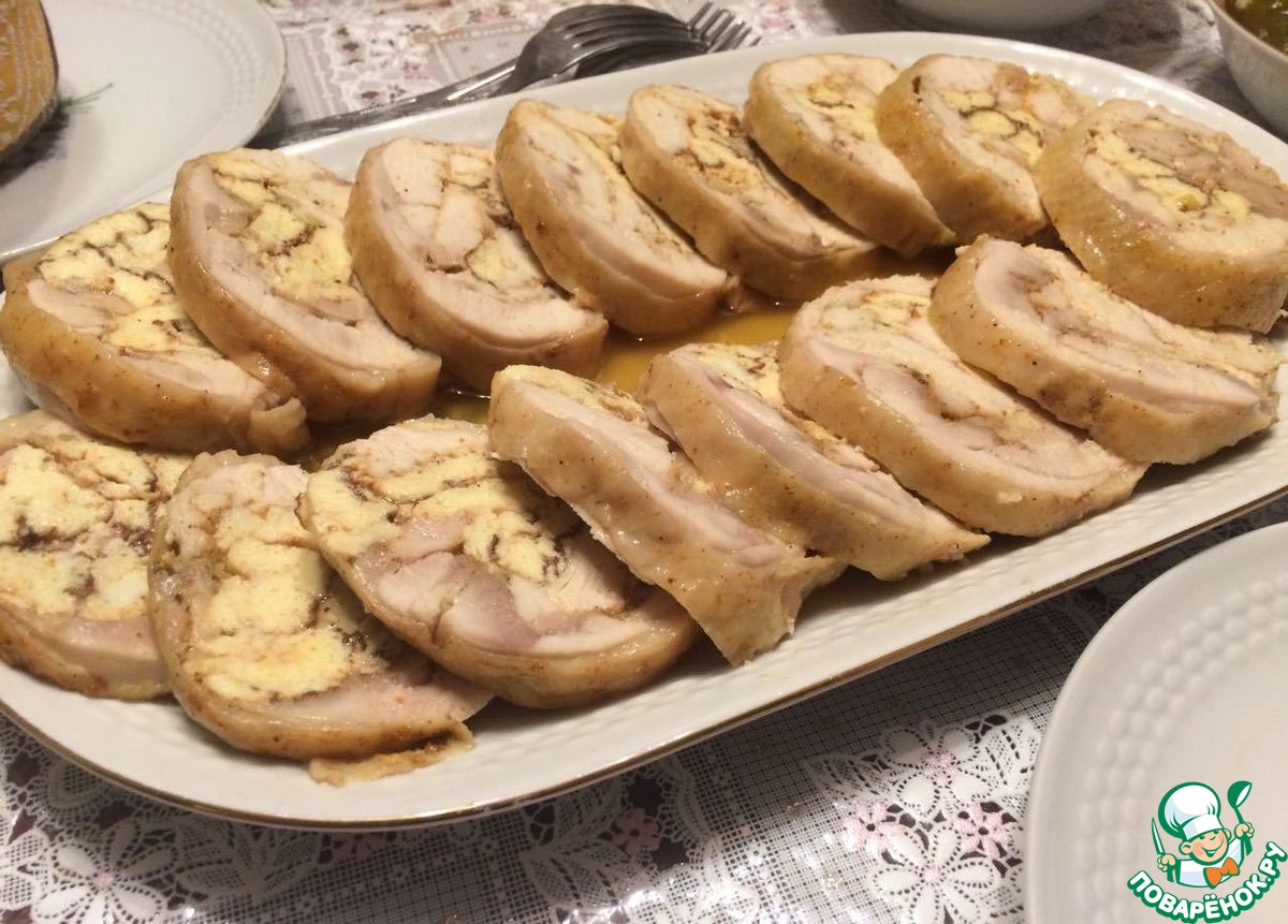 В том рецепте рулет не запекается, а отваривается в малой воде и на очень тихом огне, и вот этого-то бульона как раз хватает, чтобы заправить его желатином и залить рулет.