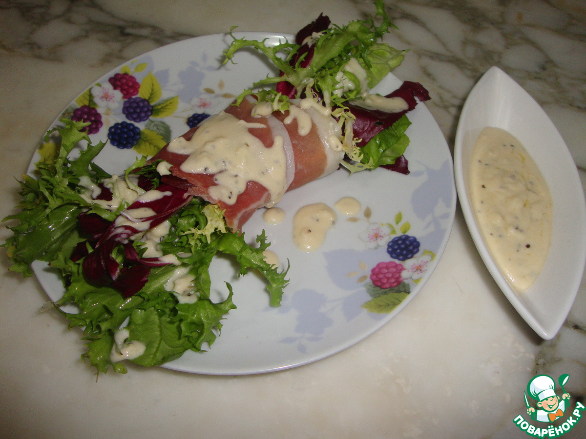 «Ассорти из салатов в пармской ветчине с сырно-коньячным соусом»