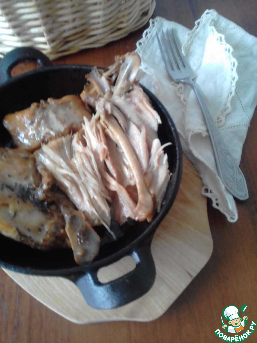 На фото я очень старалась показать, как мясо буквально разваливается на нити, обнажая косточку догола, но при этом хорошо сохраняя форму целых кусочков, что делает очень удобной подачу такого мяса - и эстетично, и очень удобно есть. Надеюсь, что это видно.