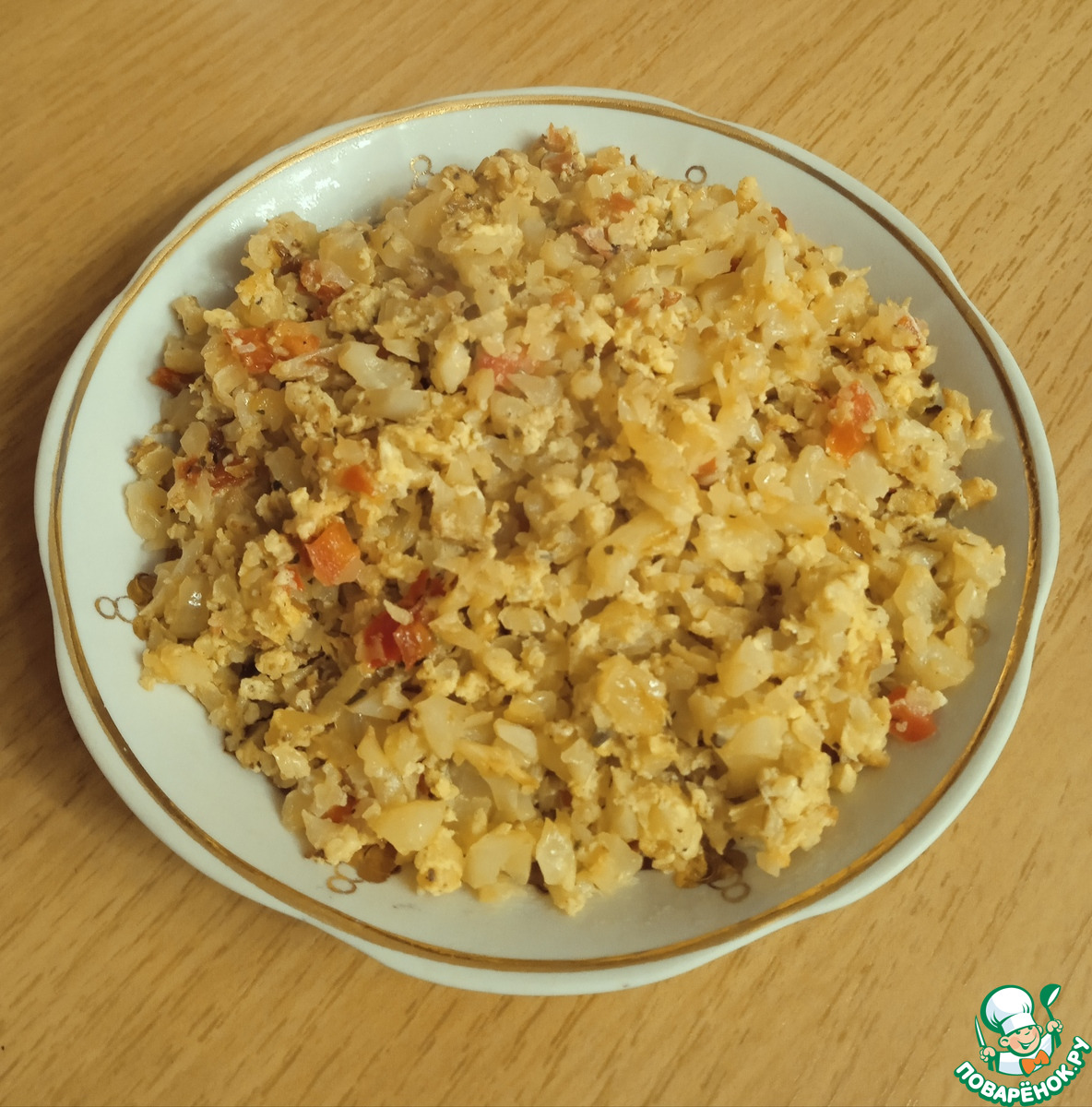 Капусту, разобрав на соцветия, залила кипятком и дала остыть в воде. Вместо чеснока болгарский перец. Яйцо, точнее омлетную массу влила в уже готовую капусту. В горячем виде восхитительно, когда постоит, совсем не то.