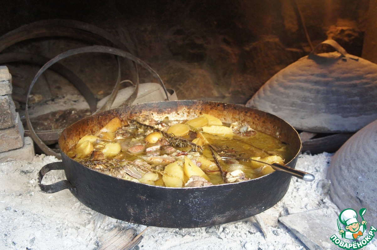 Самое знаменитое черногорское блюдо: ягнятина из-под сача. Ягнятина из-под сача – традиционное черногорское блюдо, которое запекают в горячих углях. Широко распространенный в Монтенегро сач представляет собой большую чугунную крышку (на фото она лежит справа от сковороды), выполненную в виде неглубокого колокола. Ею накрывают мясо при жарении или тесто при выпечке. На крышку насыпают раскаленные угли. Ягнятина из-под сача - традиционное мясное блюдо, считает местным деликатесом и как правило подается только к праздничному столу.