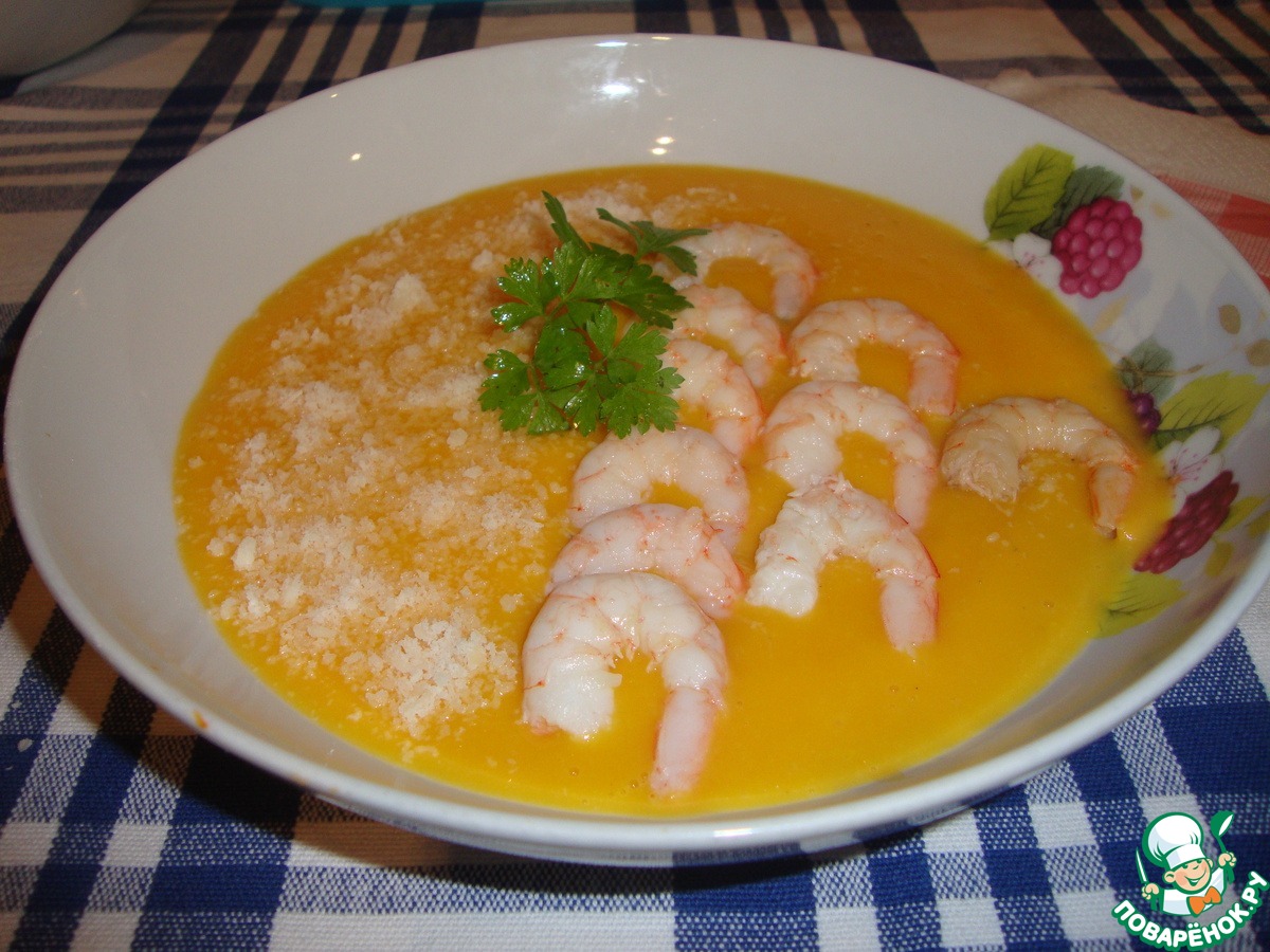 «Тыквенный суп-пюре с пармезаном, имбирем и креветками»