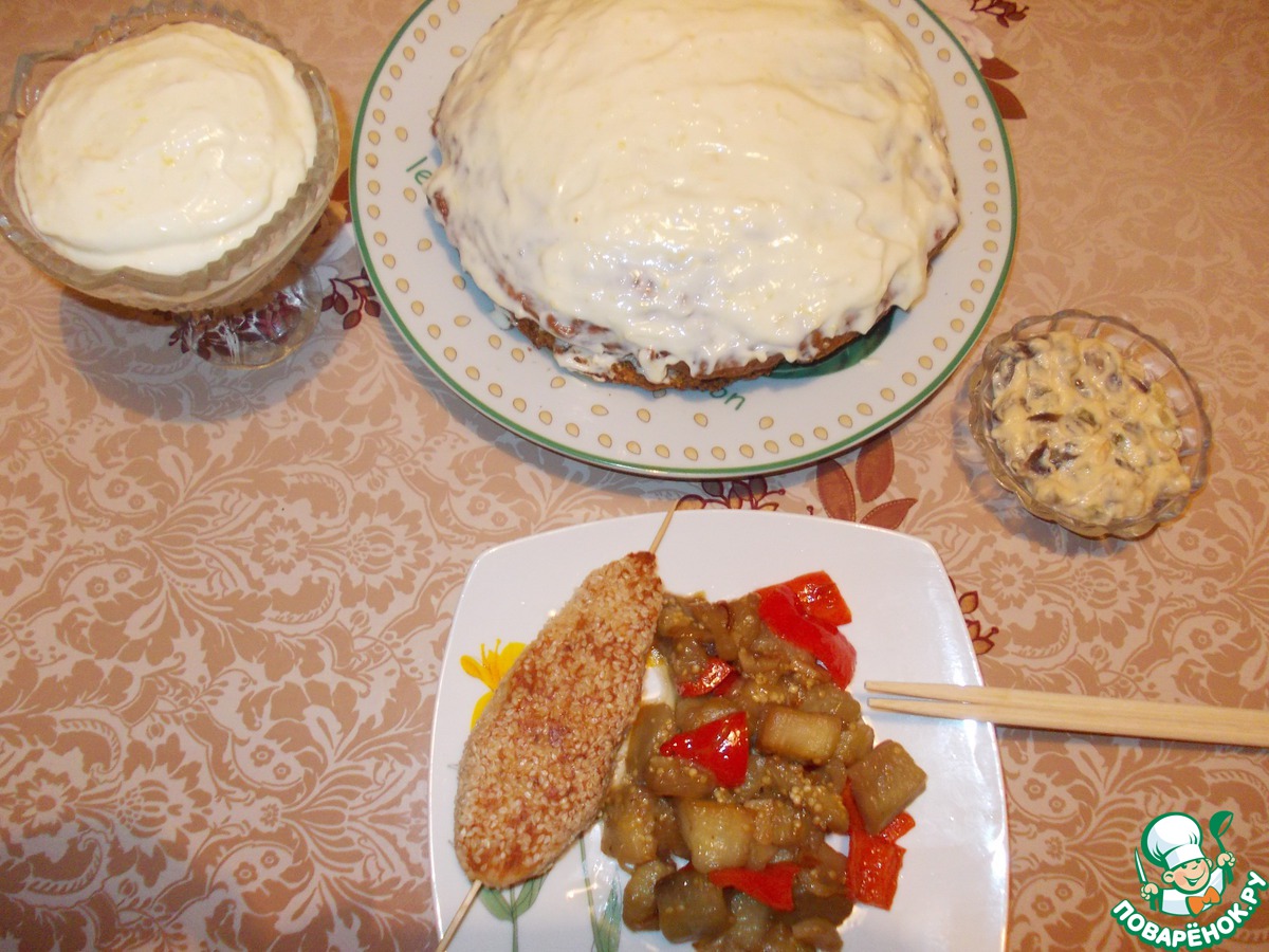 «мой ужин: баклажаны по-китайски, а-ля люля, соус пикантный, лимонный поссет и рыжий пирог»
