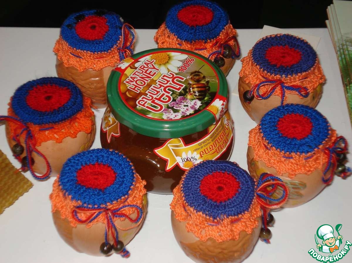 Это мед из Армении, он запакован в глиняные специальные боченки, сверху залит крышечкой из натурального воска и украшен плетением с использованием цвета национального флага страны.
