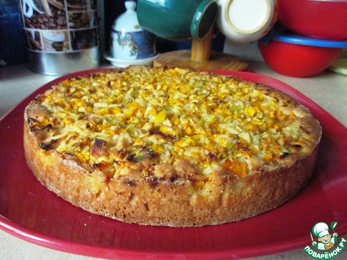 На противень d=28 см, выложите тесто, сверху - фруктово- овощную смесь, посыпьте сах. и корицей.