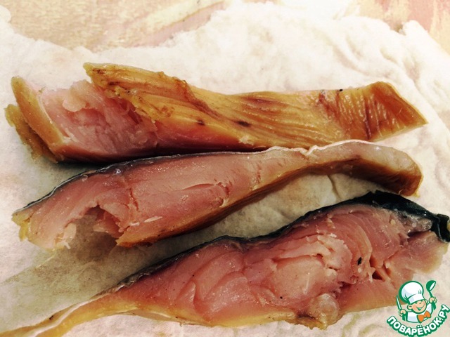 Дело было в июле, я свою горбушу после засола вялила дня 3-4 во дворе, был слабый ветерок, но погода стояла сырая. А потом мы отправились отдыхать и захватили одну недовяленную рыбеху с собой, намереваясь сточить её с пивом в любом виде Но после обильных шашлыков рыбы уже не захотелось, а ночь надвигалась пасмурная и чтобы тушка не отсырела, пришло в голову оставить ее на решетке на уже не дающих жара, но еще дымящихся углях. Утром сняли с мангала великолепнейшую подкопченную рыбу! Вторая тушка дождалась нас в холодильнике, отлично довялившись между тем на пергаменте. Великолепный результат при минимуме и хлопот, и затрат. На фото на лаваше ломтики подкопченной, конечно