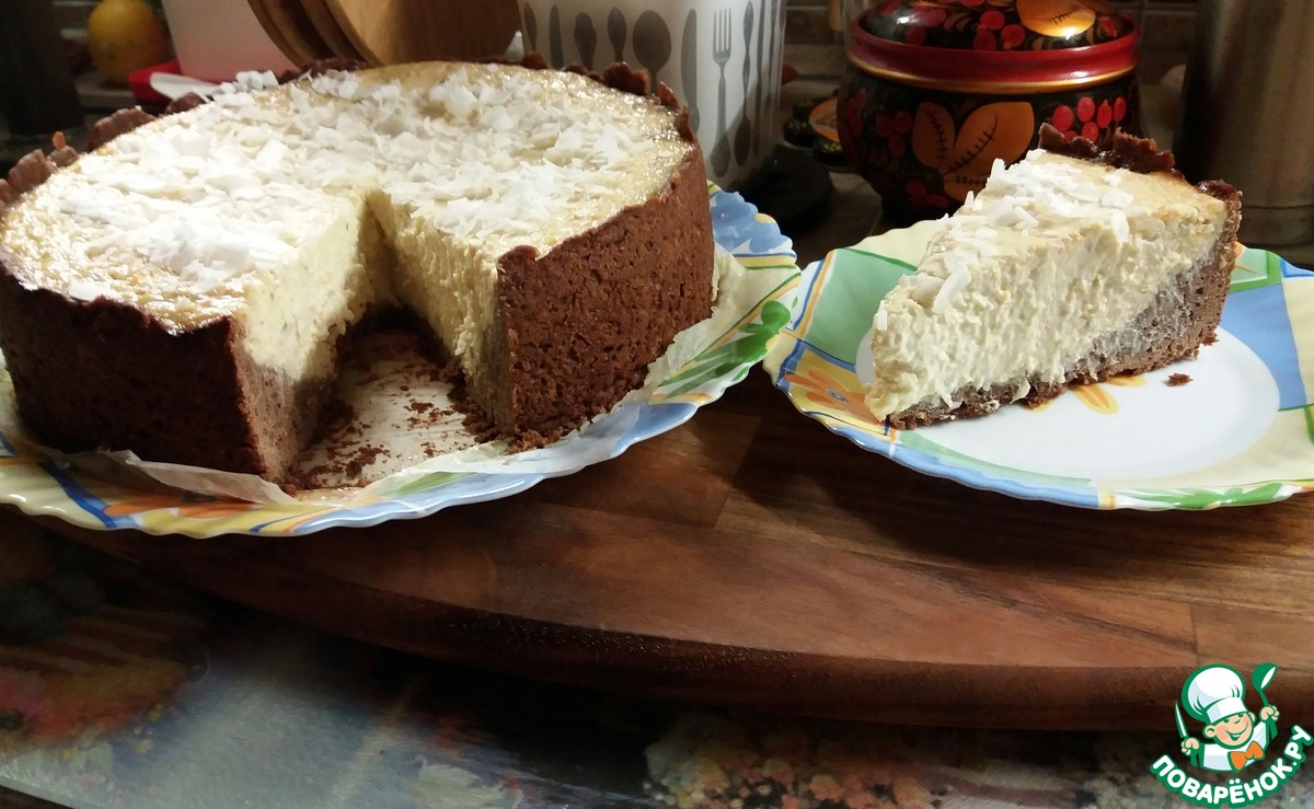 Как раз достаем форму из духовки через 4-5 минут после выпекания основы. Выливаю аккуратненько начинку в форму, чтобы до краев нашего теста осталось 5-7 мм. Пирог состоит в основном из начинки, ее очень много. Ставлю в духовку, температура та же - 180 град. Здесь ориентируйтесь по своей духовке. В рецепте сказано 35 минут, но мне этого мало - пирог колыхался. Я ставила 50-60 минут, проверяла. Серединка все равно твердой не будет, застынет потом, а вот края сразу видно готовы, такие мягко-тверденькие. Больше 50 минут держать не надо! Достаем, посыпаем чем угодно - шоколадом, орешками, сах.пудрой.Пусть остывает и в холодильник. Попробуйте, не пожалеете!