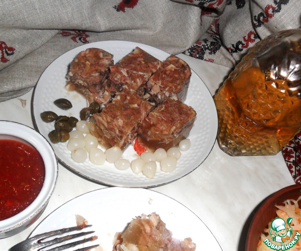 Это он, любимый холодец нашего дома, всегда из трех видов мяса: именно так готовили и научили меня бабушка и мама. Акцентирую только на паре моментов - я никогда не доливаю воды в процессе варки холодца, поскольку даже не даю ему кипеть: томлю 5-6 часов, допуская не более чем подрагивание бульона на поверхности. И луковичку опускаю неочищенную (конечно, тщательно вымытую), это придает приятную золотистость желе. Да, и еще - из курятины несомненно лучше в холодец брать ножки-бедрышки, шейки, остов. Грудка слабовата для обогащения вкуса холодца в качестве третьей мясной составляющей. Кстати, холодец оооочень выигрывает от добавления гусятины.