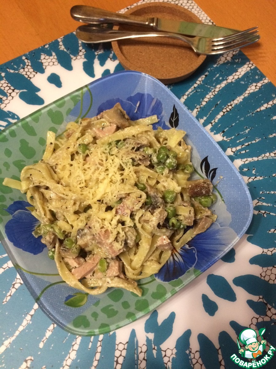 «паста с ветчиной и зелёным горошком»