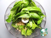 Петрушку и базилик промываем, отделяем грубые стебли. Несколько красивых листочков оставляем для украшения. Измельчаем в блендере зелень, орехи и зубчик чеснока. |