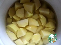 Приготовить картофельное пюре: слить воду, измельчить картофель, добавить яйцо и сливочное масло. Затем натереть на терке сыр и вмешать в пюре половину тертого сыра. |