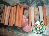 Крабовые палочки разморозить, разрезать пополам. |