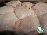 Цыпленка промыть, нарезать на порционные кусочки и немного посолить. (Я брала куриные бедра) |