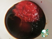 Соевый соус в мисочке смешать с кетчупом, оливковым маслом и кофе. |