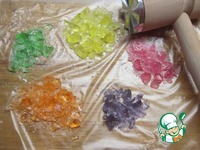 За это время нужно измельчить (на несколько кусочков) леденцы. Толочь леденцы лучше между двумя мешочками, так они не будут разлетаться. |