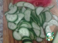 Добавить свежий огурец полукольцами, жарить, чтоб чуть размяк. |