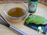 2. Венчиком смешать соевый соус с оливковым маслом и, продолжая взбивать, добавить сок 1 лайма. Приправить перцем. Второй лайм порезать на тонкие кружочки. |