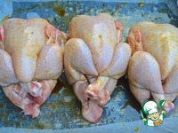 4. Выложить цыплят на противень грудкой вверх и запекать при температуре 200 С (200 – 220, в зависимости от вашей духовки) 35 минут, чтобы они стали золотистыми. |