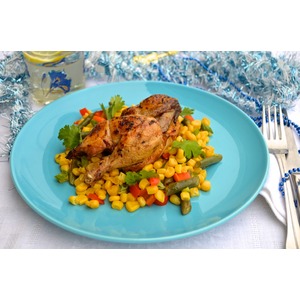 Описание: Нежное мясо цыпленка со сладковатым кукурузным салатом – легкая альтернатива основному блюду на новогоднем столе. Подойдет для тех, кто боится набрать много лишних килограммов за праздники, но хочет вкусной необычной еды.