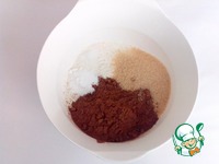 Возьмем 2 емкости:в первой смешаем сухие ингредиенты: муку, сахар, какао, соду, соль. Во второй жидкие: воду, растительное масло, уксус, ром. Получается негустое тесто. |