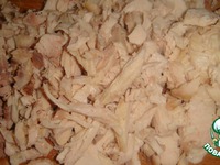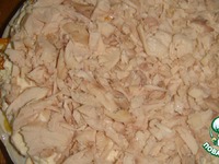 Выложите половину подготовленных ингредиентов слоями,поливая майонезом затем выложите нарезанными ломтиками курицу |