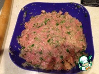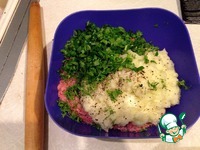 Пока тесто подходит, готовим начинку. К фаршу добавляем измельченный лук и зелень, по вкусу солим и перчим. |