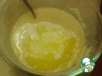 Жидкую часть теста влейте в сухую часть (сахар, мука, корица, разрыхлитель) и быстро перемешайте. Добавьте растопленное сливочное масло и снова тщательно перемешайте всё тесто. |