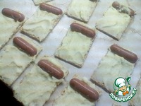 Намазать на каждый хлебец картофельное пюре. Положить на каждый хлебец, намазанный пюре, половинку сосиски (чуть ближе к середине) и дать постоять в таком виде минут 5-7. |